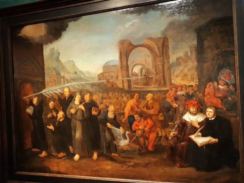 In het water de reformatie ketters met Luther en Calvijn dicht bij het schip.